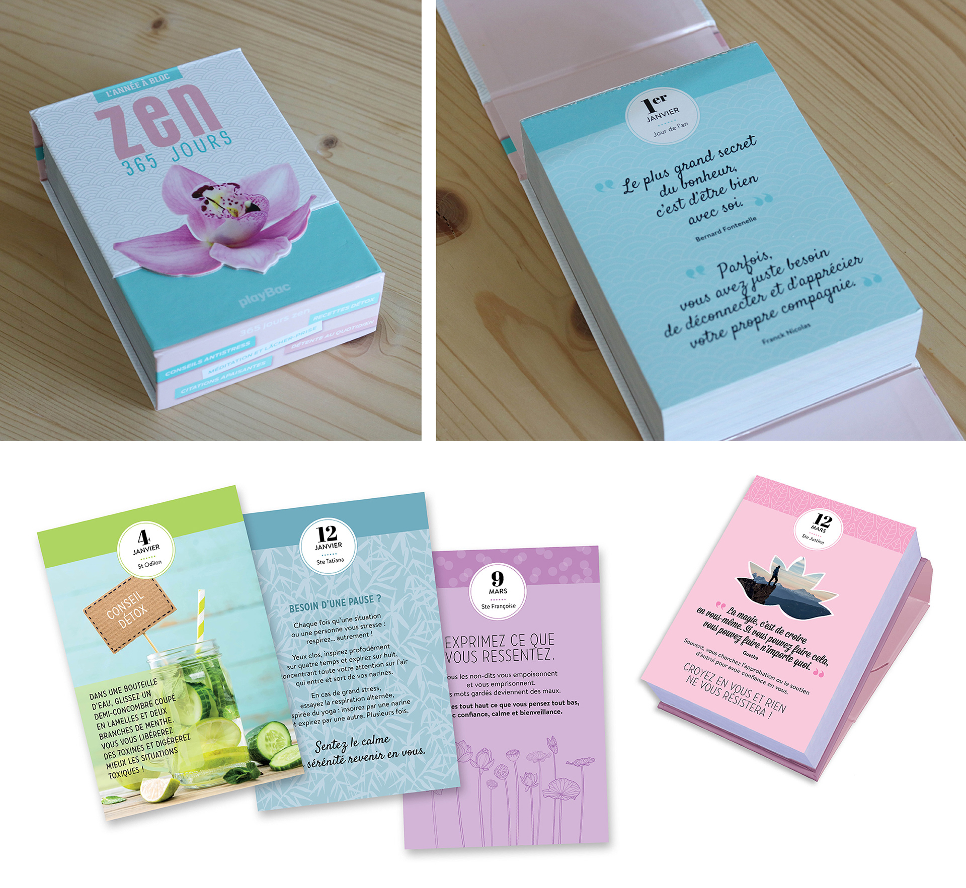 Pour les éditions PlayBac, j'ai imaginé cet éphéméride Zen, plein d'ondes positives et de jolies citations. À chaque jour sa surprise !